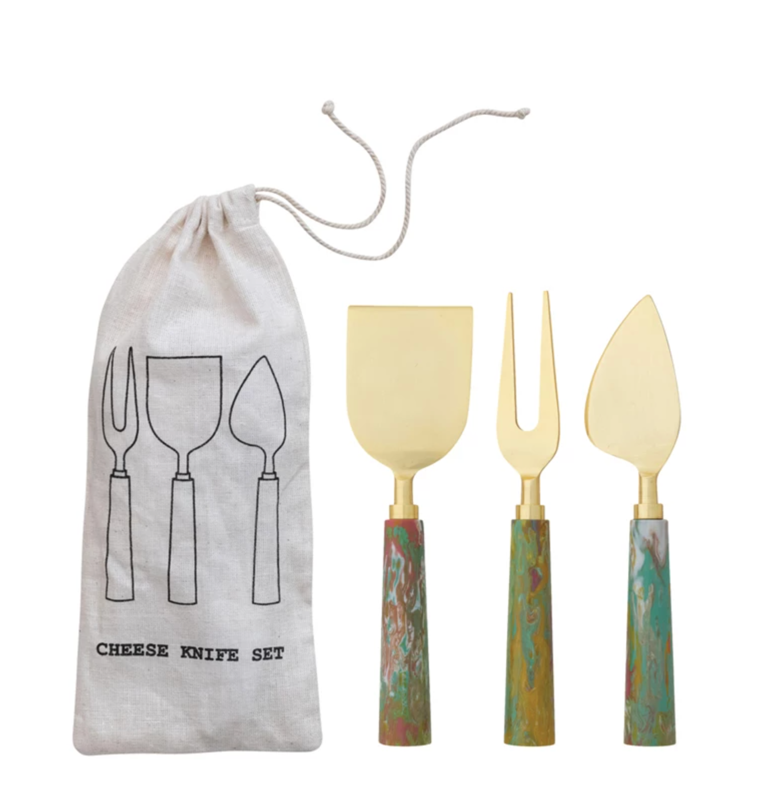 Cheese Knives w/ Marbled Resin Handles, Set of 3 in Drawstring Bag