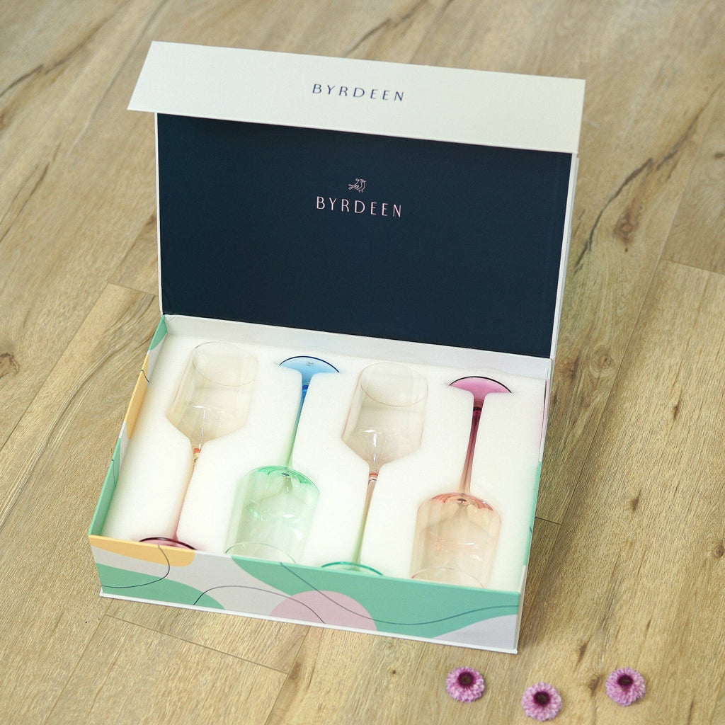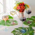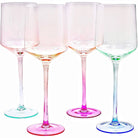 • H: 24cm W: 7.5cm Hola! We are Mezclada Wine Glasses, which means ‘mixed’ in Spanish. We are a mix of each of the colors in the Costarriqueña Collection: Flora, Quetzal, Cielo, and Rio. With our distinctive colors you will know exactly which of us is yours, and we'll be locatable from across the room. It’s a win-win. Well actually, a win-win-win-win because there are four of us. We come carefully protected in luxurious packaging, ready to make your acquaintance. Cheers!