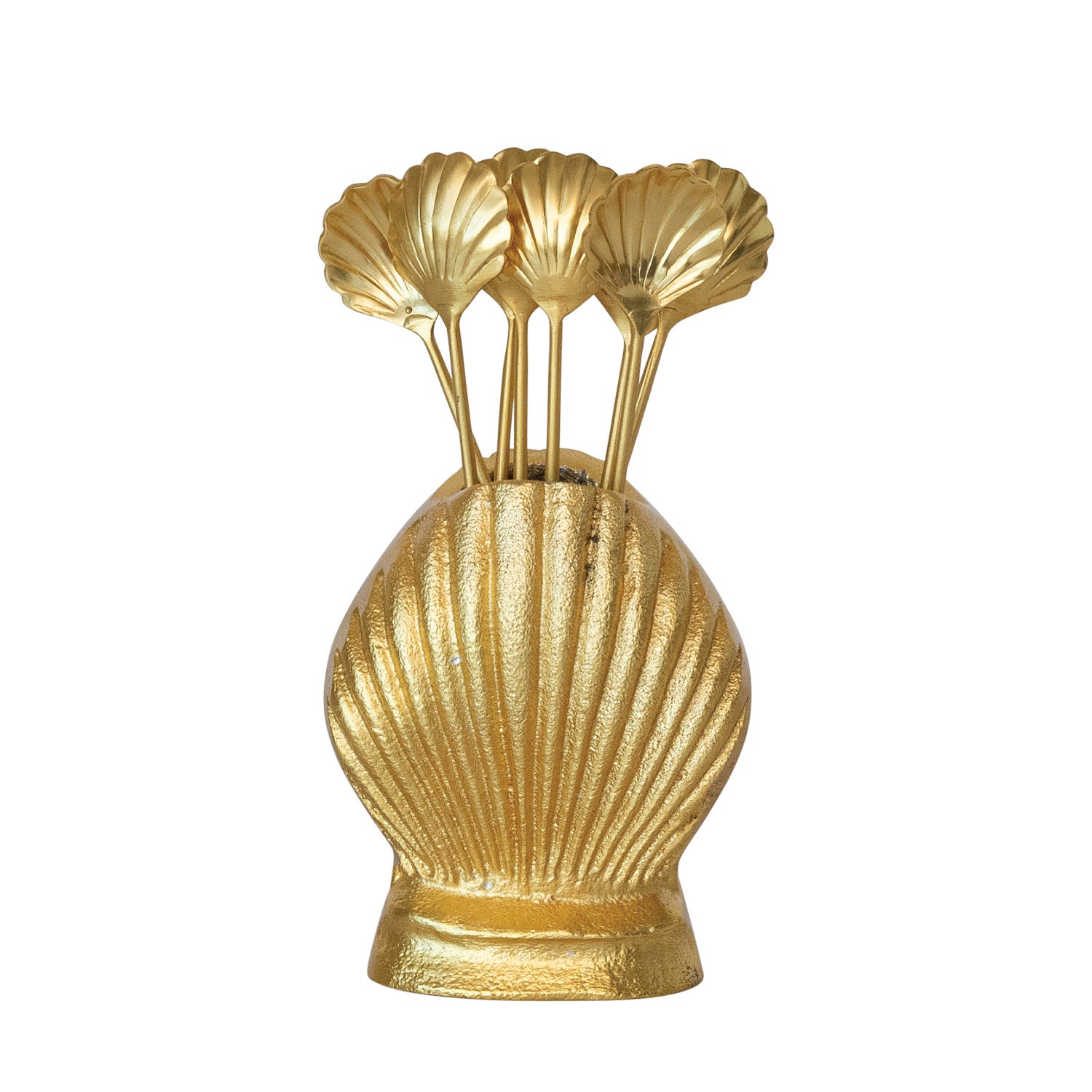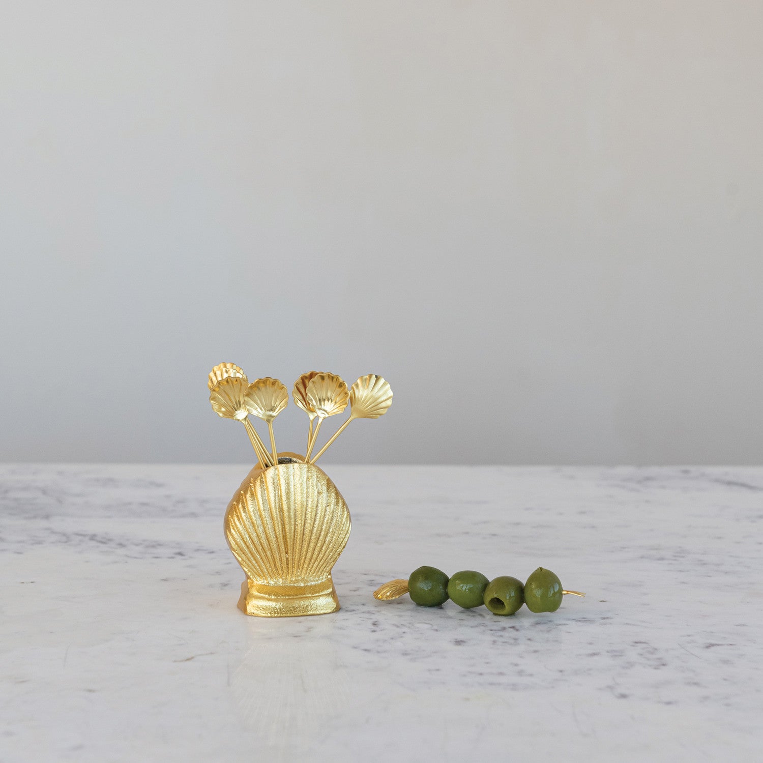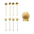 Catalog Name: 4"L Stainless Steel Appetizer Picks w/ Shell Shaped Handles in 2-3/4"L x 2-3/4"H Shell Shaped Holder, Gold Finish, Set of 9