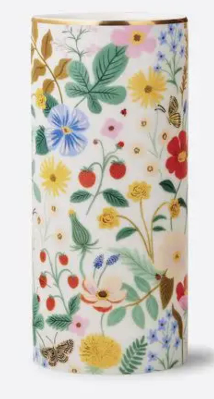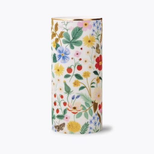 Flowers for your flowers. This porcelain cylinder vase features the sweet blooms and berries of our Strawberry Fields print with a gilded rim for extra shine. DETAILS - Porcelain - Full-color illustration with metallic gold accents - 7" tall - 3.125" D - Box: 4" x 4" x 7.75" - Hand wash or wipe clean with damp cloth - Imported