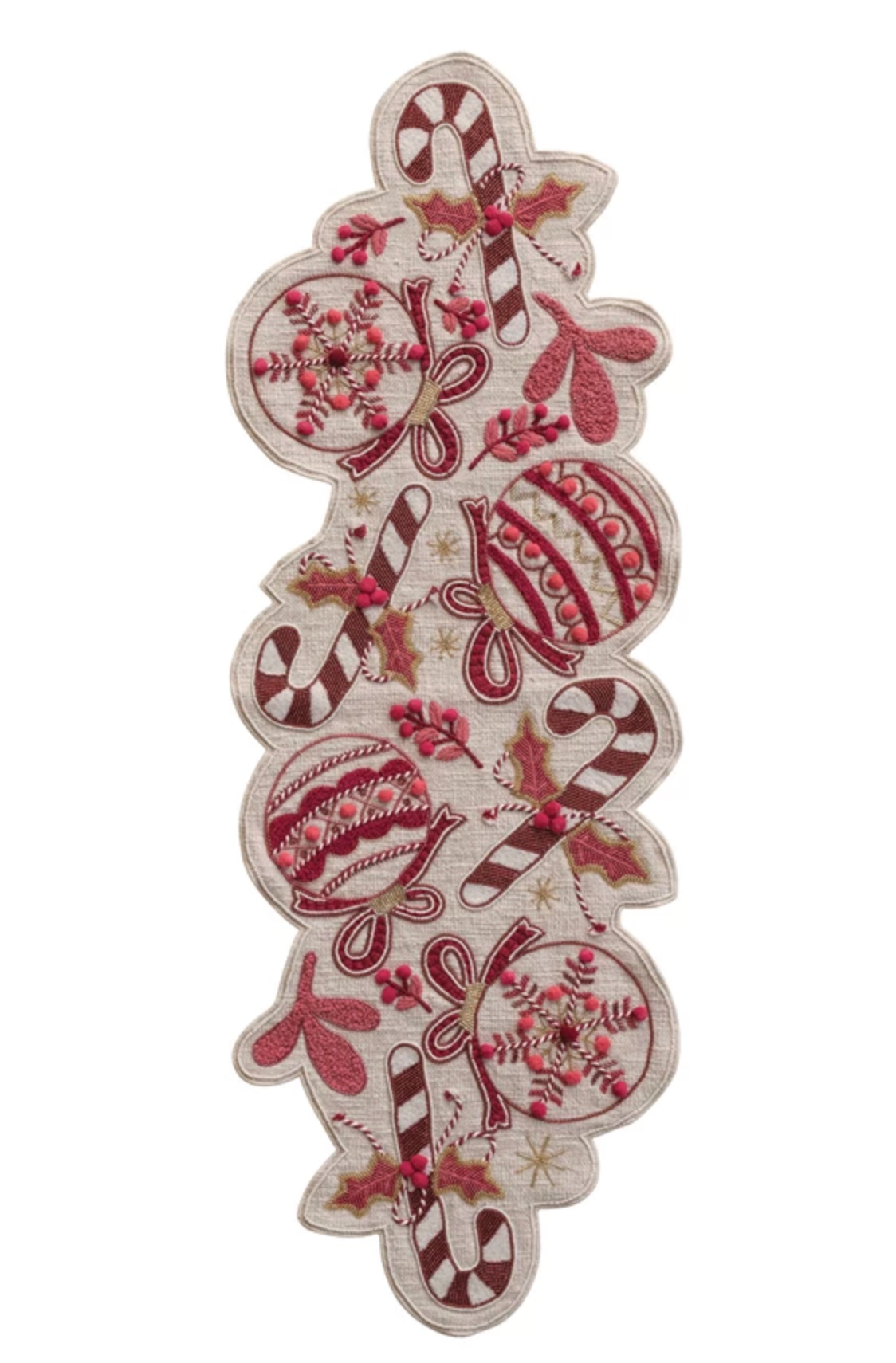 38"L x 14"W Hand-Embroidered Cotton Slub Printed Table Runner w/ Applique, Ornaments, Candy Canes, Beads & Pom Poms, Pink, Red & White ©