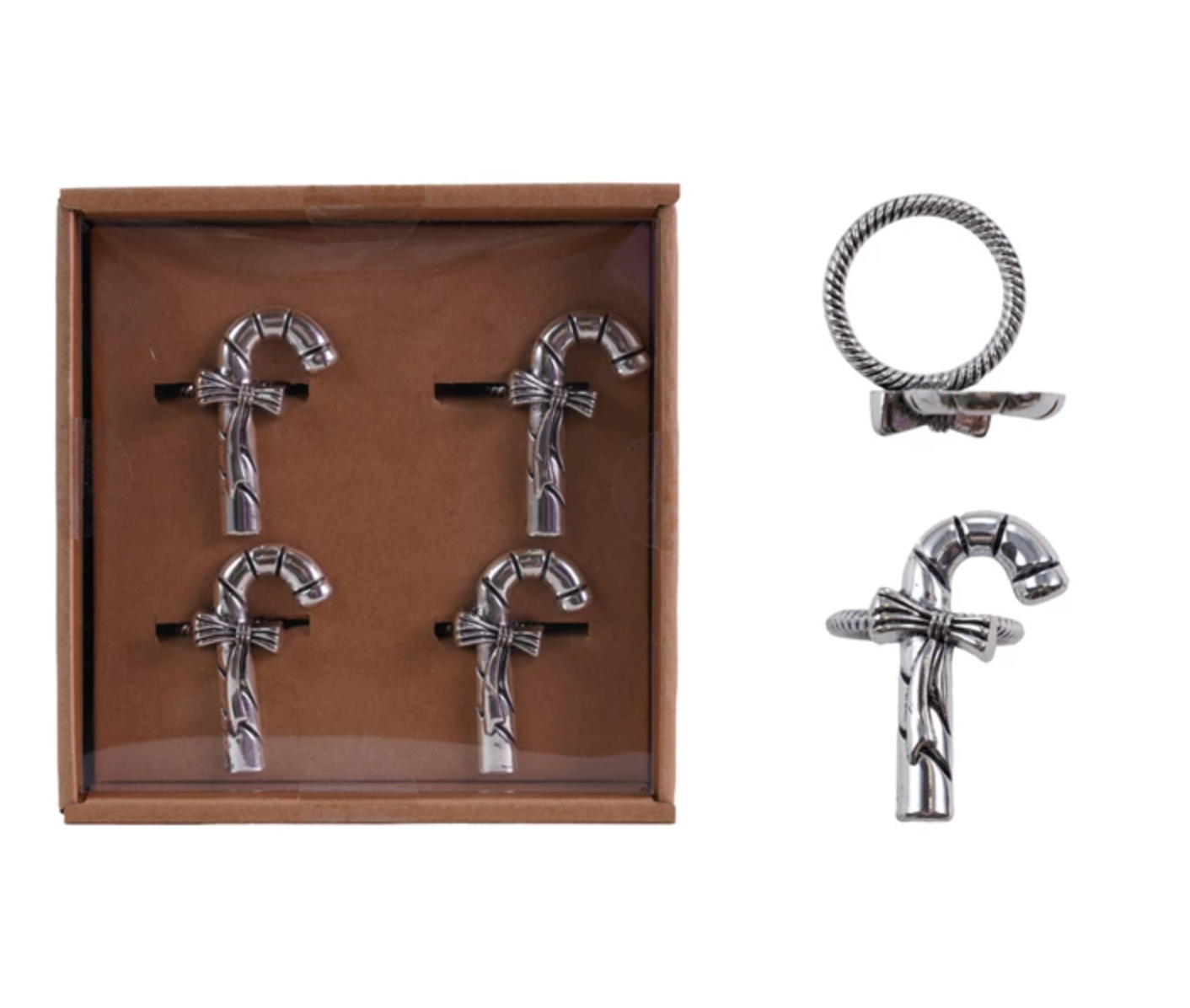 Approximately 2"H Zinc Alloy Napkin Rings w/ Candy Canes, Silver Finish, Boxed Set of 4