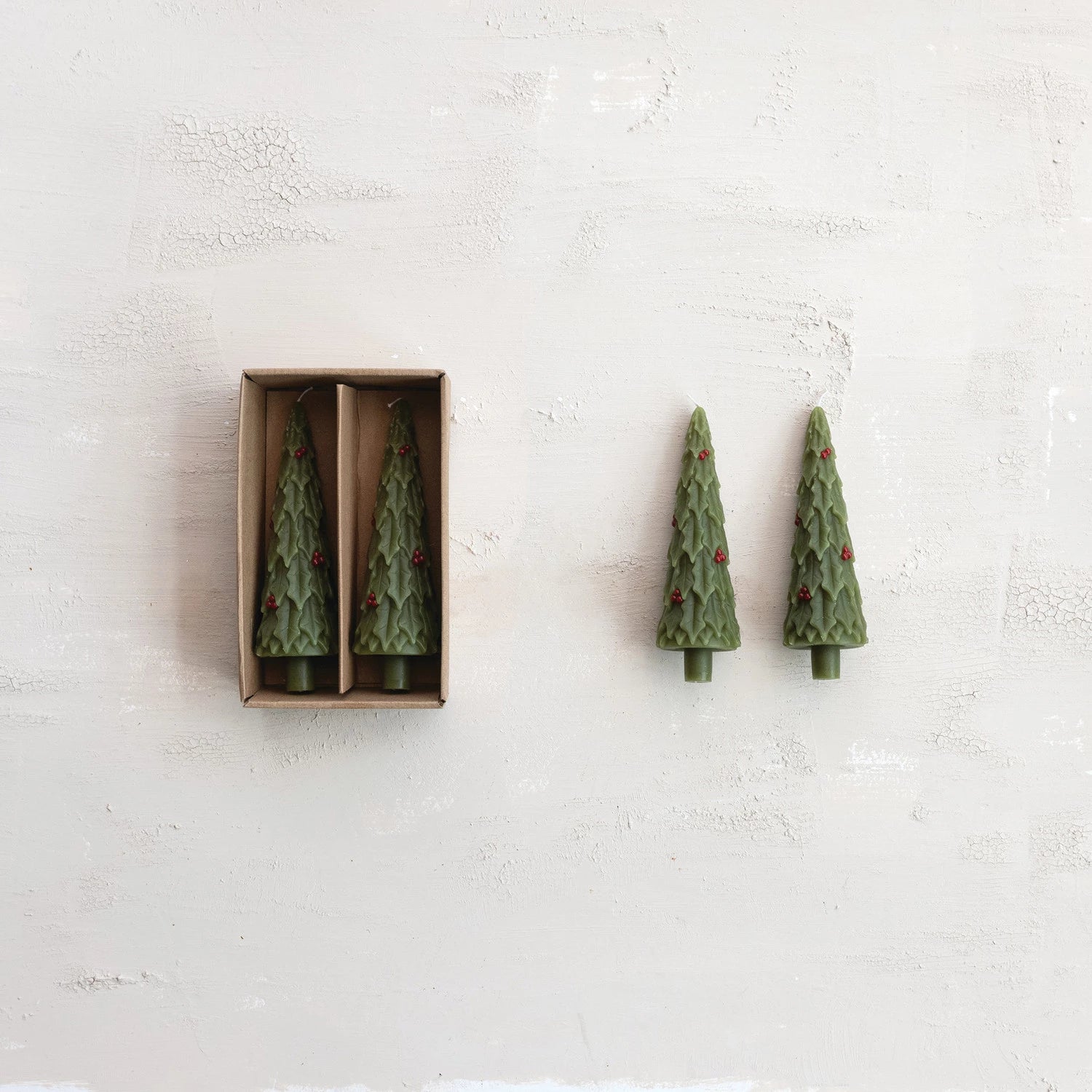 Unscented Tree Shaped Taper Candles in Box with Holly, Set of 2