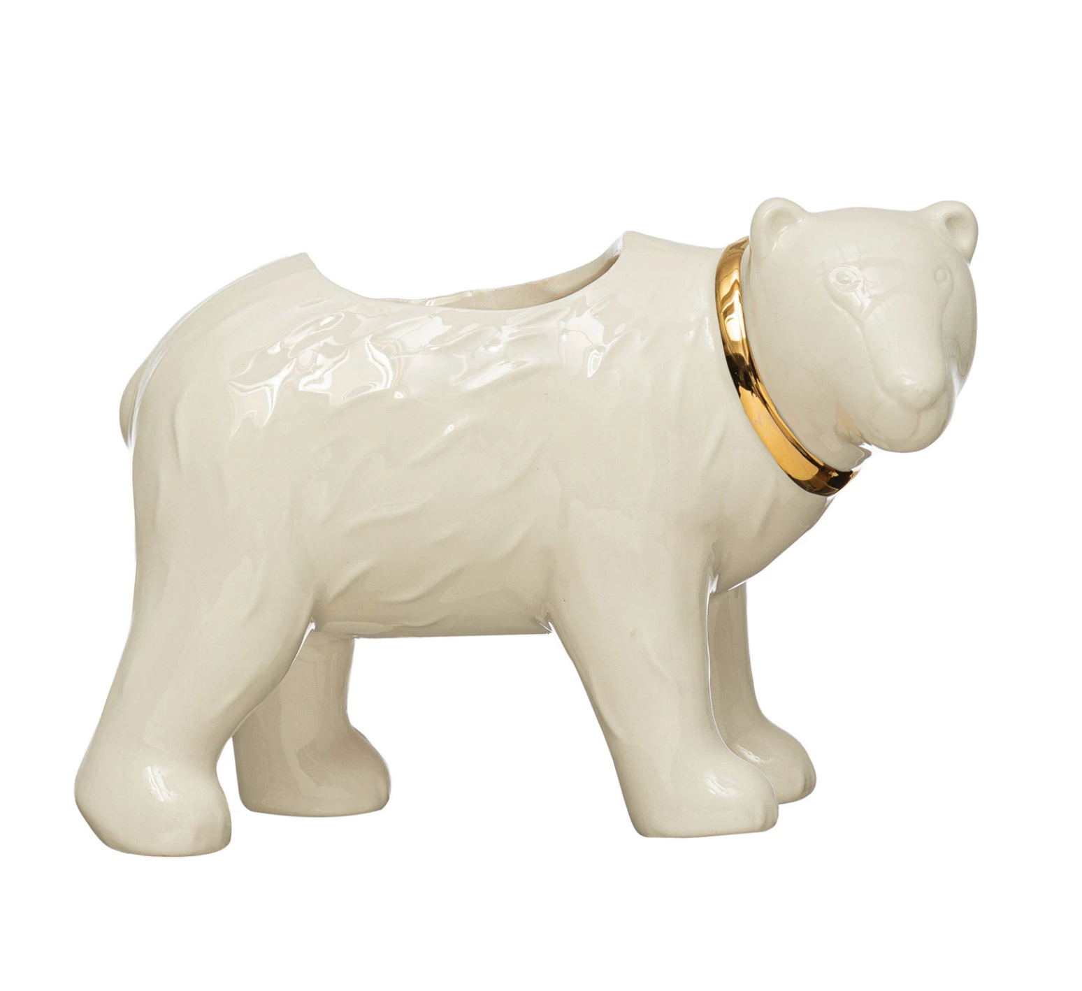 Crafted from smooth, durable white stoneware, this adorable polar bear features a small basin perfectly sized for succulents, air plants, or small flowers. Its sophisticated look is completed by a gleaming, hand-painted gold ring around its neck, giving this snowy friend a regal, jewelry-like accent. Perfect for a desktop, bedside table, or as a thoughtful gift.