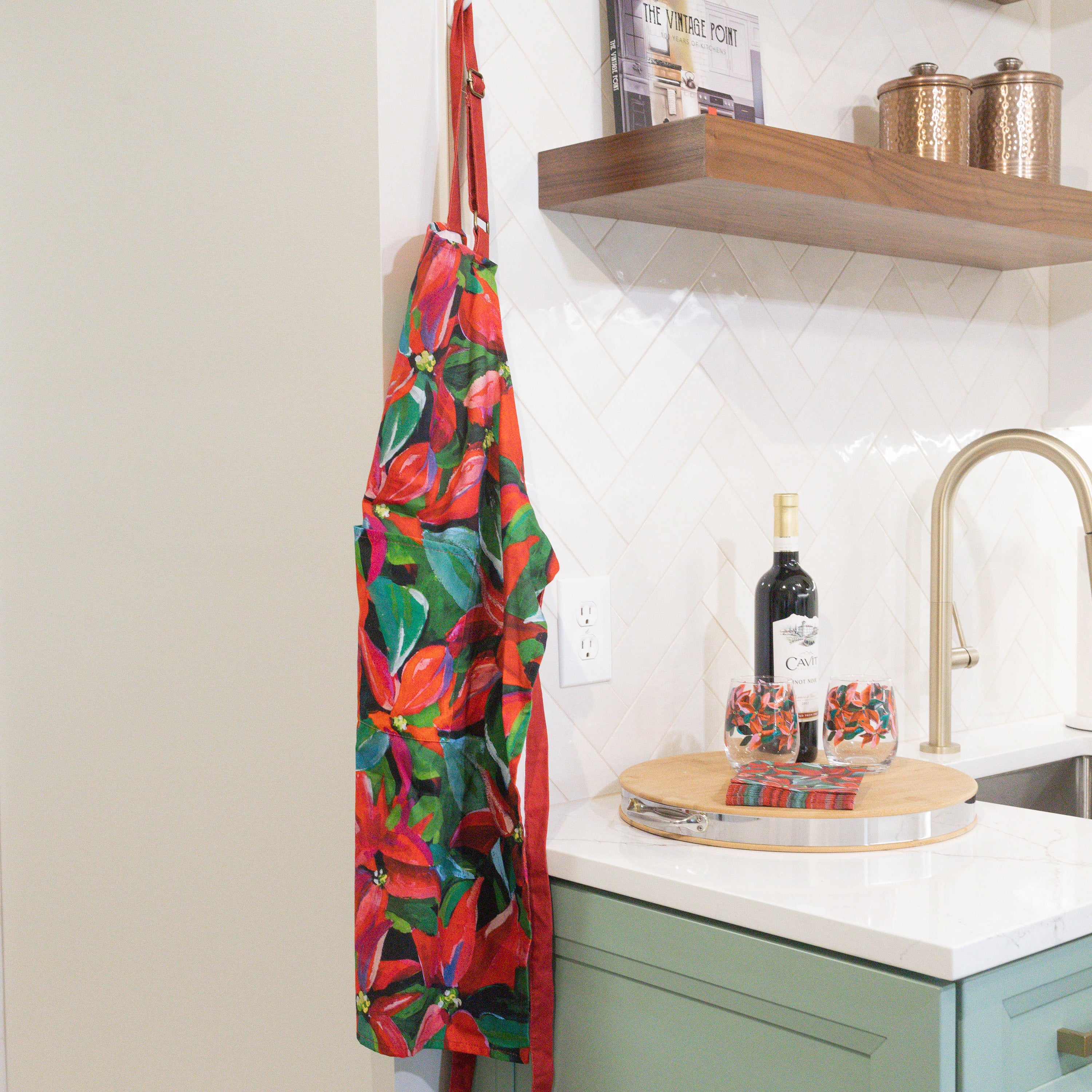 Expertly crafted from high-quality, 100% cotton material, this Poinsettia print apron is the perfect addition to any kitchen. Measuring 27 x 32.5 inches, it provides ample coverage and protection while cooking. Keep yourself clean and stylish with this practical and durable apron.